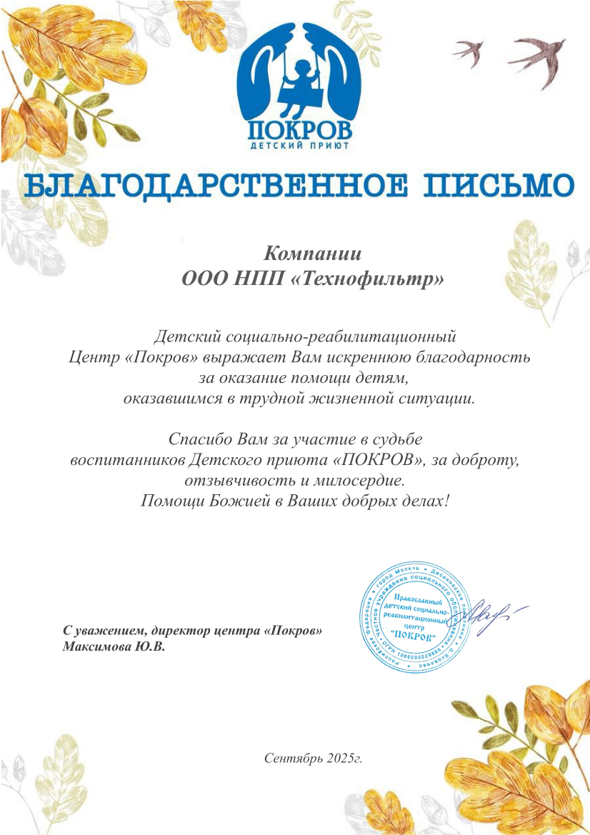 Technofilter received a letter of thanks from MBUDO "Lakinsky Children's Art School." Lakinsk, 2025.