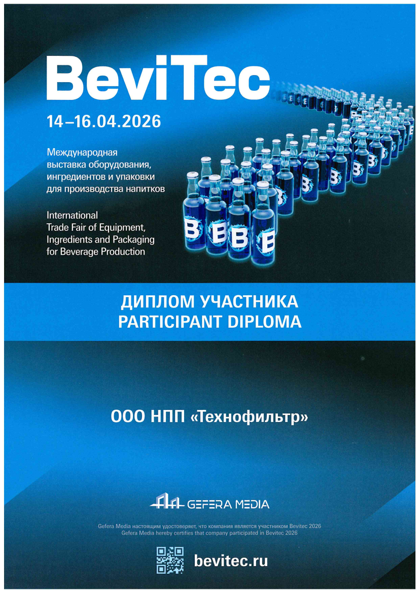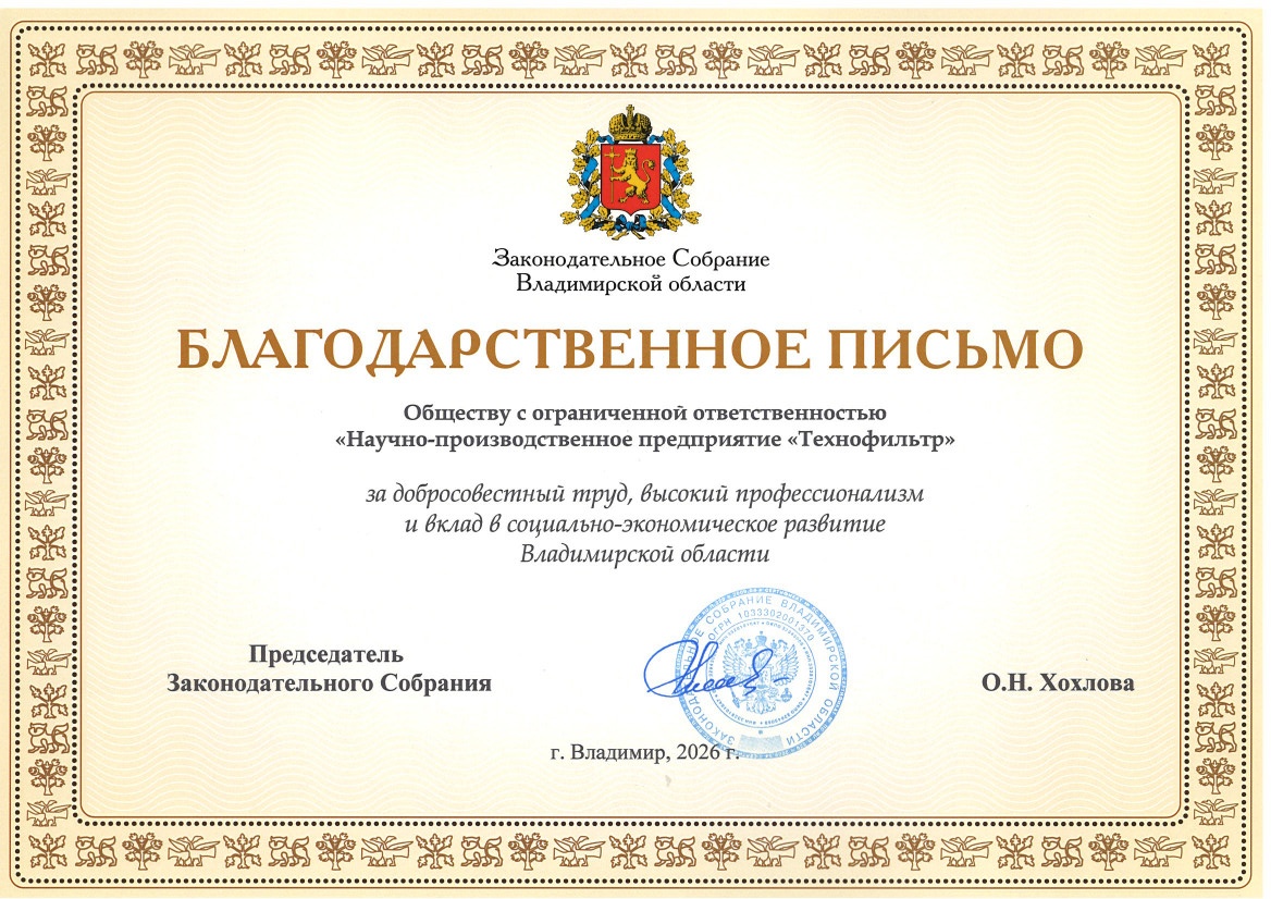 Technofilter received a Certificate from the Union of the Chamber of Commerce and Industry of the Vladimir Region on the entry into the non-state Register of Russian legal entities, the financial and economic situation of which indicates their reliability as partners for entrepreneurial activity in the Russian Federation and abroad.