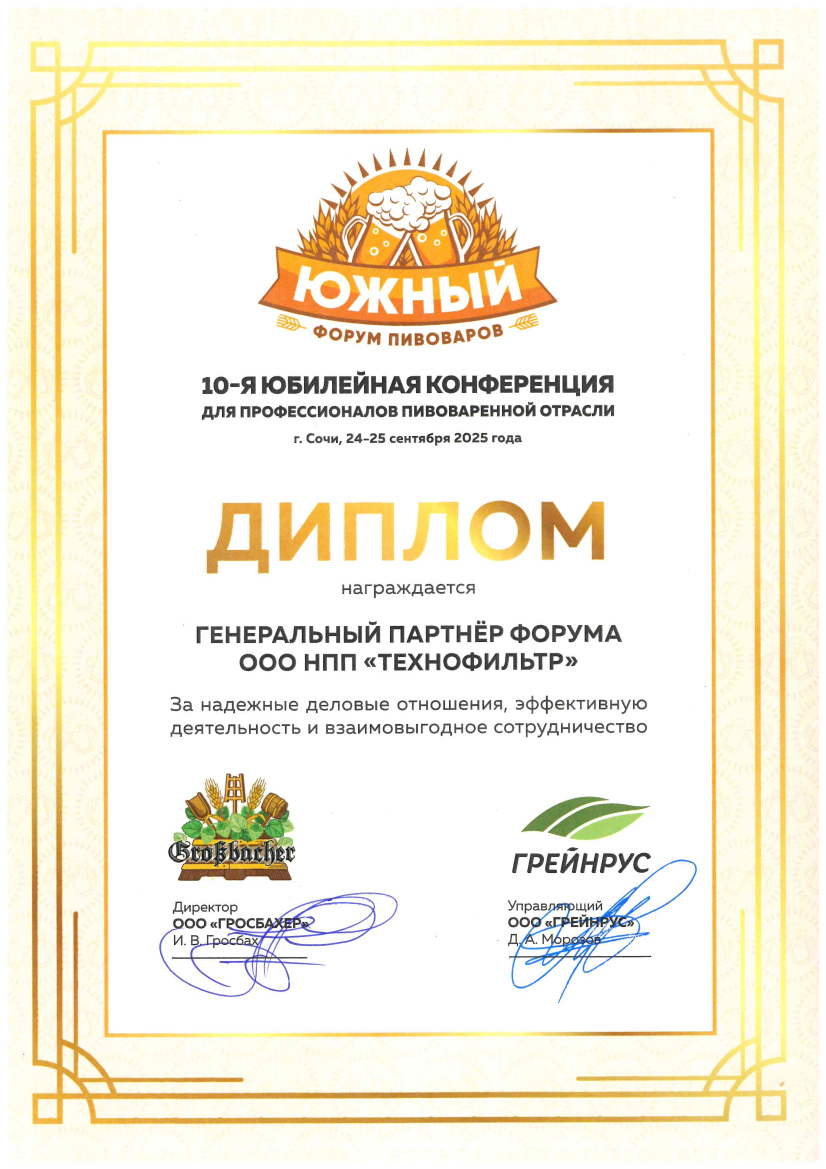 Certificate of participant of the IV Scientific Conference of Brewers of Russia and Neighboring Countries Volga beer Pro 2024 Manufacturer and developer of filter elements Technofilter for its contribution to the development of the brewing industry of the Samara region.