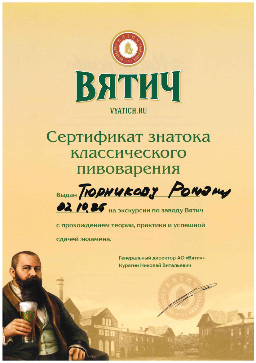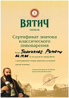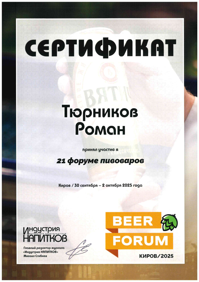 Certificate to Roman Tyurnikov, speaker of the conference on practical brewing and exchange of experience "REALBREW 2024",