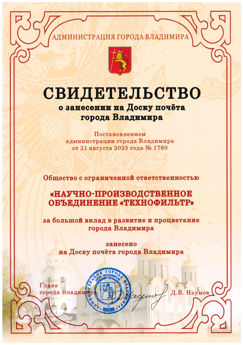 Certificate of entry on the Board of Honor of Technofilter among the best enterprises in Vladimir, 2025.