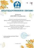 letter of thanks from the Selsky Charitable Foundation to the director of Technofilter Tarasov A.V. for participating in the Warm House project.