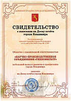 Certificate of the Union of the "Chamber of Commerce and Industry of the Vladimir Region" on entry into the Register of reliable partners.