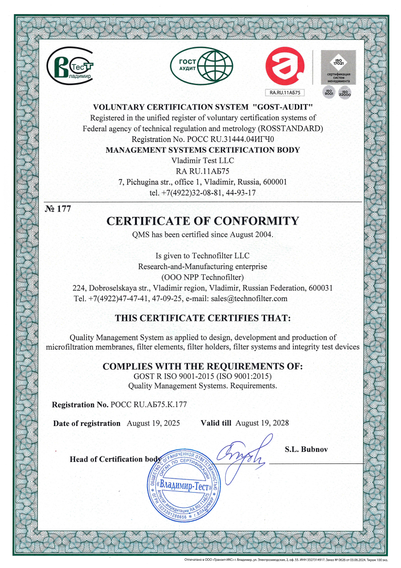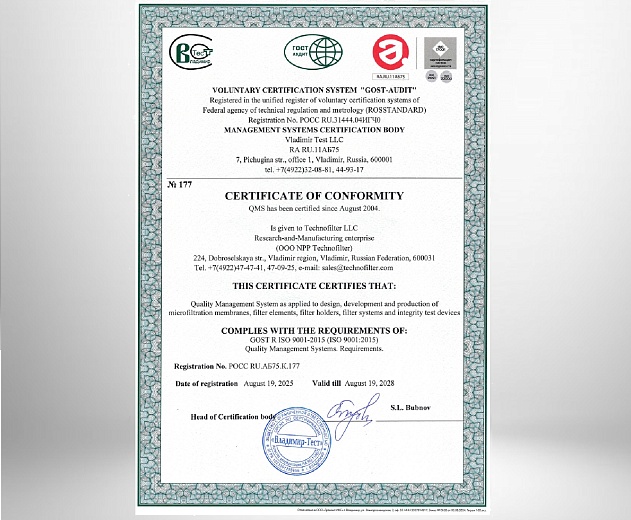 The assessment of the existing Quality Management System was carried out by the authorized certification body of Vladimir Test, LLC (Accreditation certificate No. RA.RU.11AB75). This is the seventh certificate issued to Technofilter RME, LLC (Quality Management System has been certified since August 2004).
